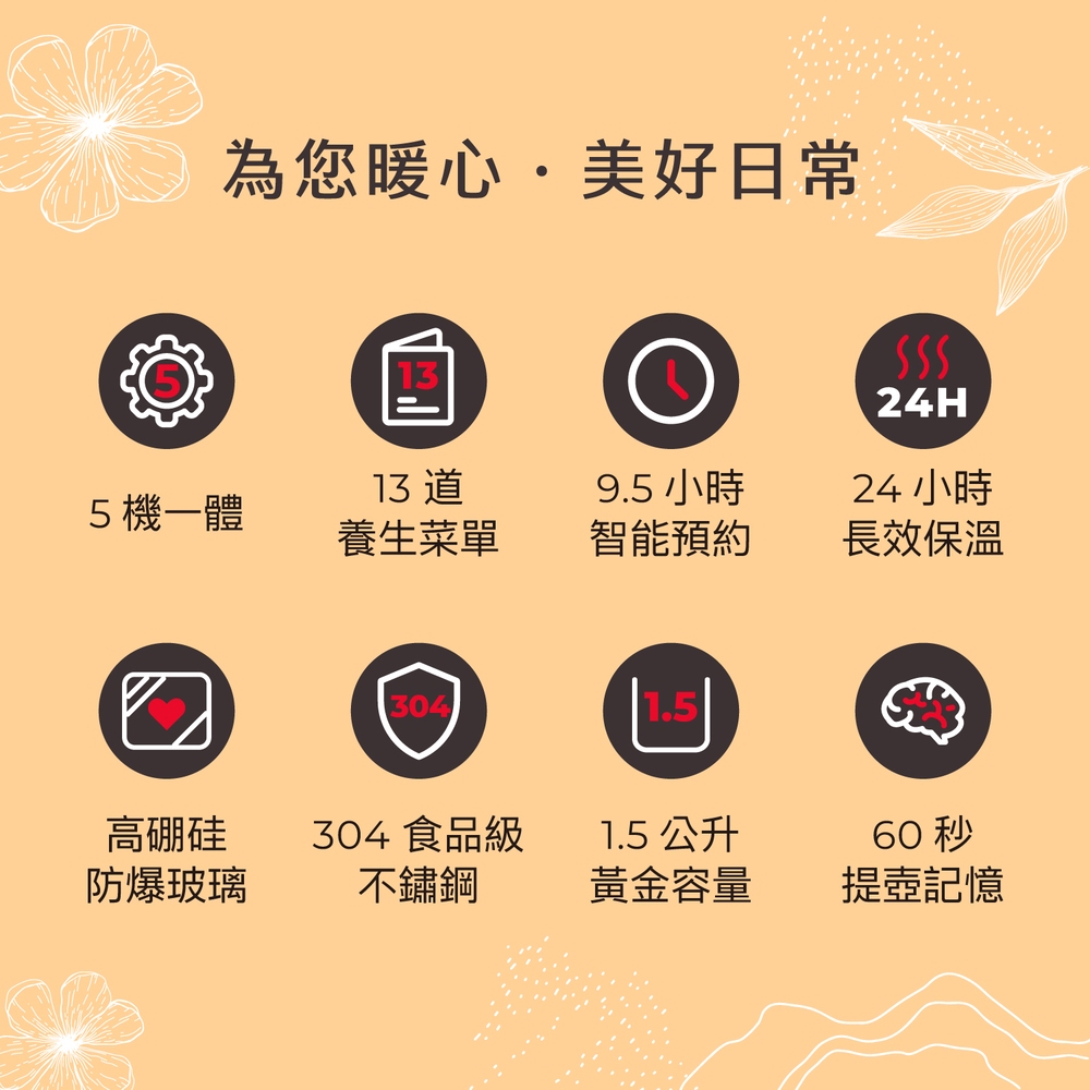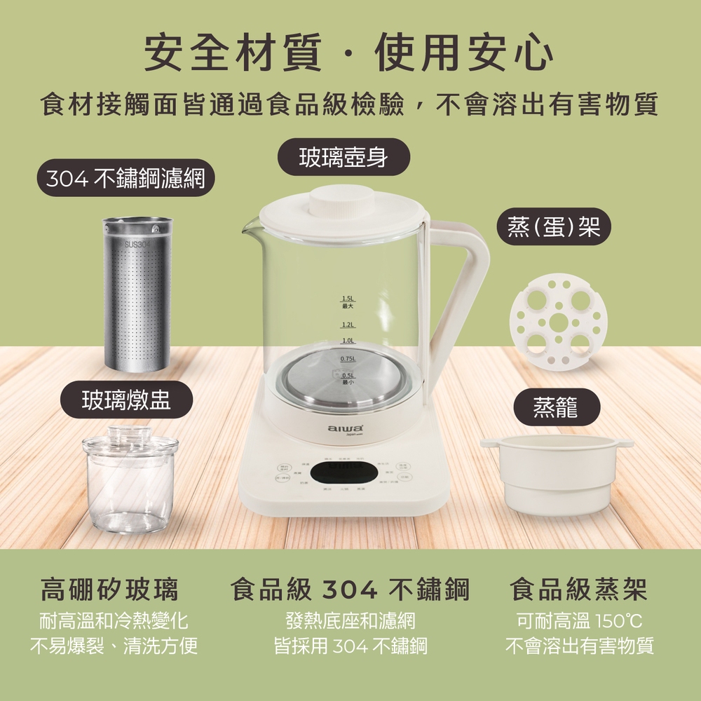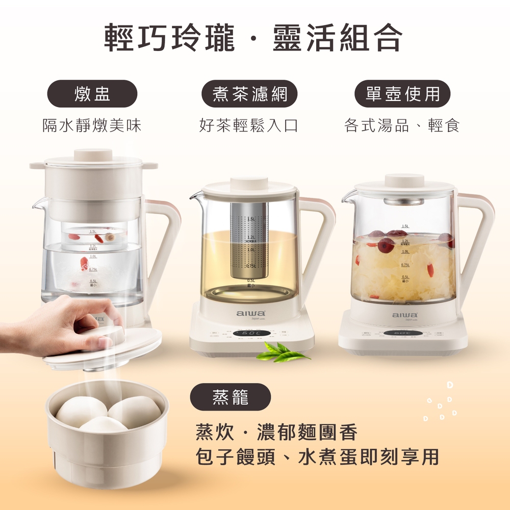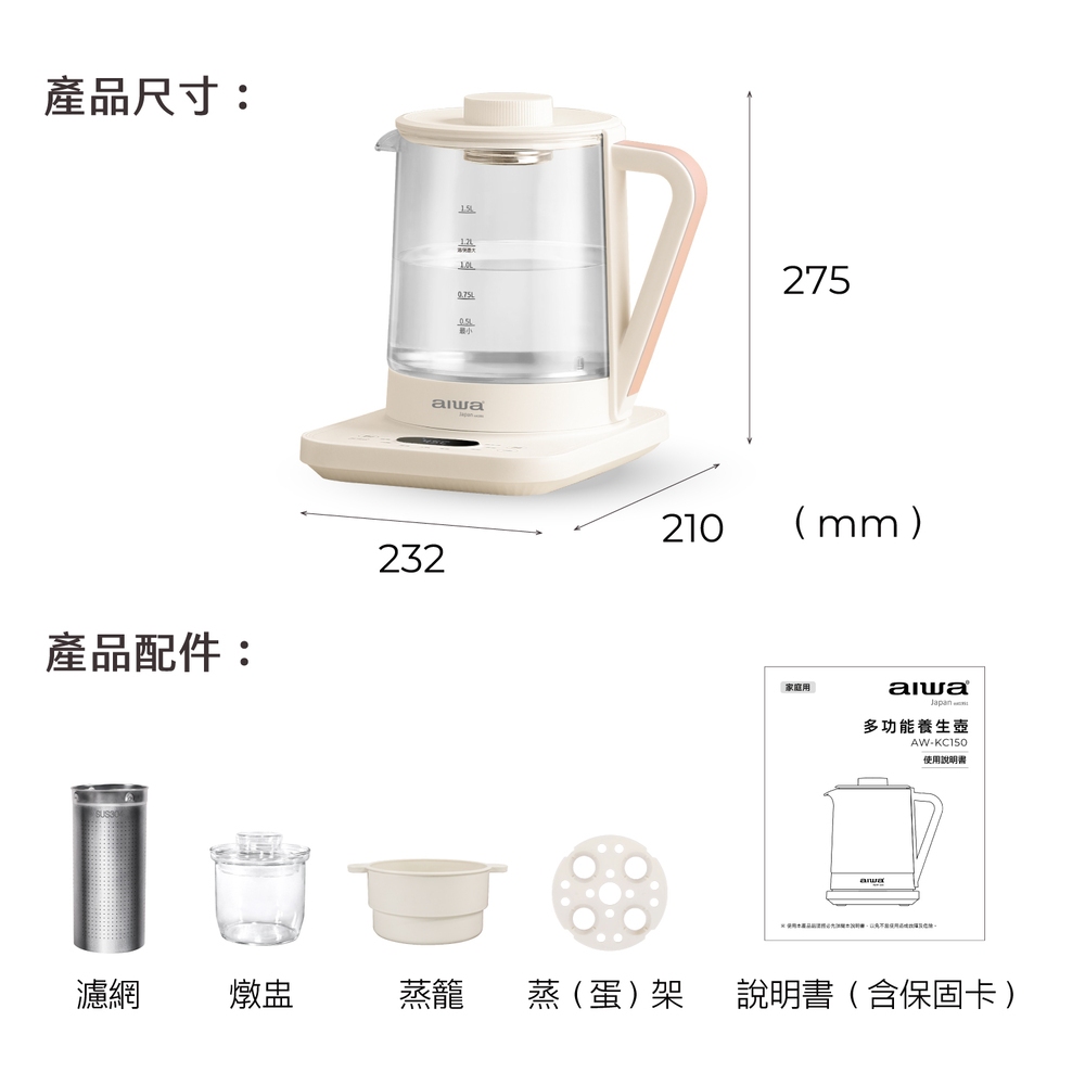 AIWA 1.5L 多功能養生壺 AW-KC150,結合蒸、煮、燉、泡等五大功能,內建 13 項智慧菜單,從日常開水、花果茶到進補藥膳、養生燕窩都能輕鬆完成。高硼矽玻璃壺身搭配 304 不鏽鋼發熱盤,耐用安全又導熱均勻。9.5 小時預約與 24 小時保溫功能,讓您隨時都能喝到剛剛好的溫度。1.5L 黃金容量,一壺滿足一家人的健康需求,是居家必備的養生好幫手!健康養生,從這一壺開始!