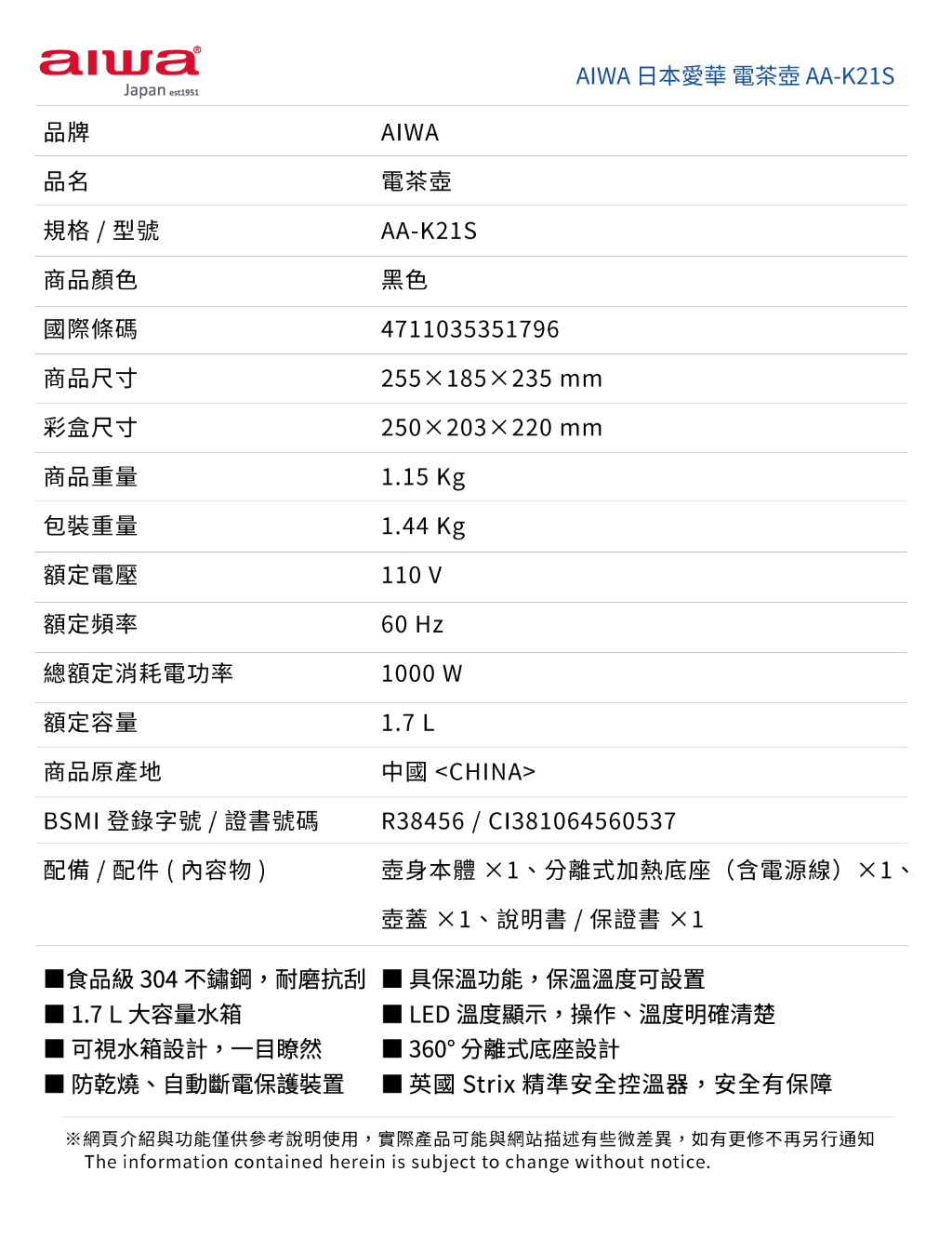 |AIWA 愛華|1.7L 11段控溫電茶壼 AA-K21S|