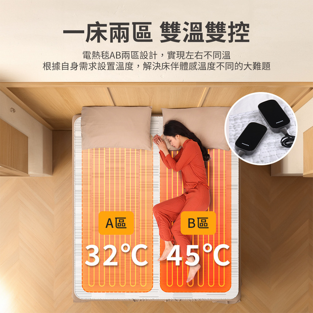 內建智能定時功能,可設定自動關機時間,安全又節能。雙人雙控款式更支援左右分區獨立控溫,貼心滿足不同睡眠習慣。控制器可拆卸設計,方便洗滌與收納。