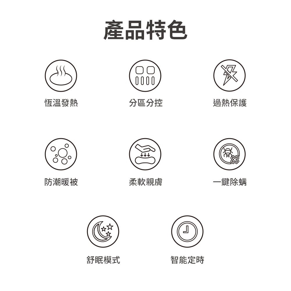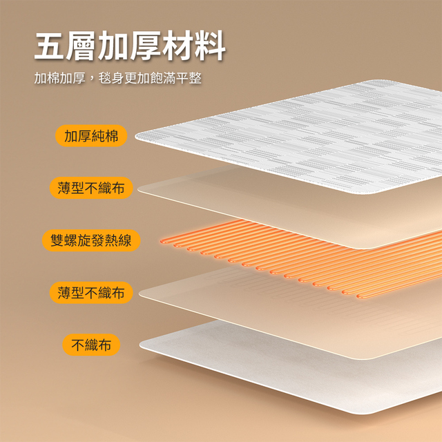 全系列使用柔軟親膚絨面布料,觸感細膩不刺激肌膚,無論是單人使用或雙人共享,都能帶來穩定而溫潤的暖意。其內部均勻導熱線路設計,升溫迅速且分布均勻,避免局部過熱。