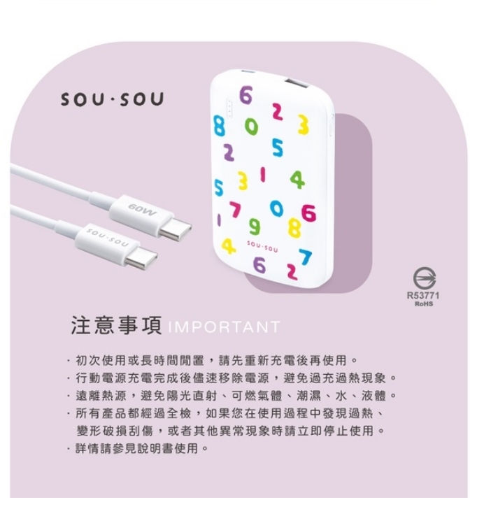 SOU.SOU十數昆 超薄Type C 雙輸出行動電源 + 60W C to C 快充傳輸線
