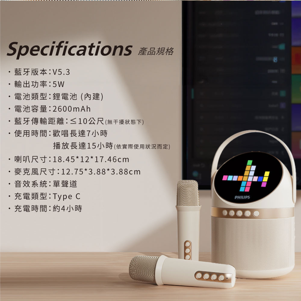 使用時間:歡唱長達7小時/播放長達15小時(依實際使用狀況而定)