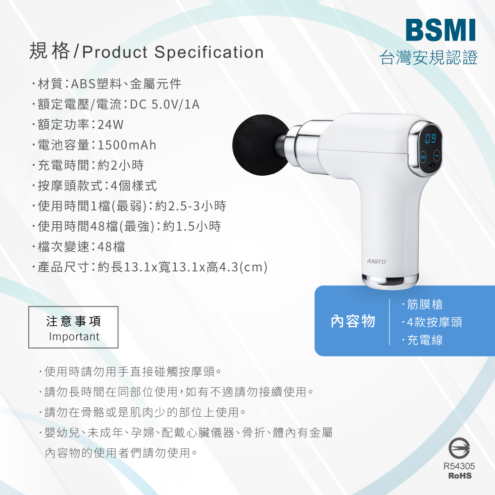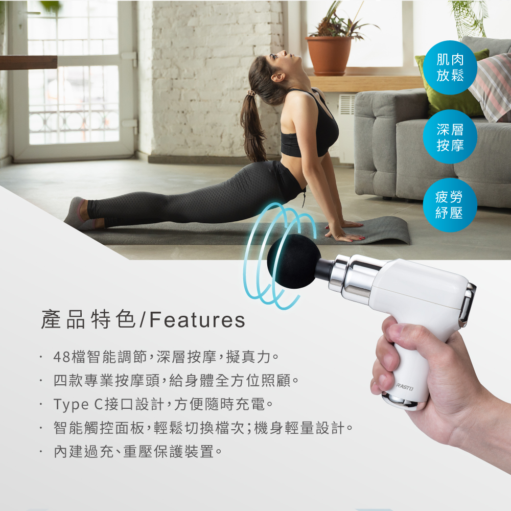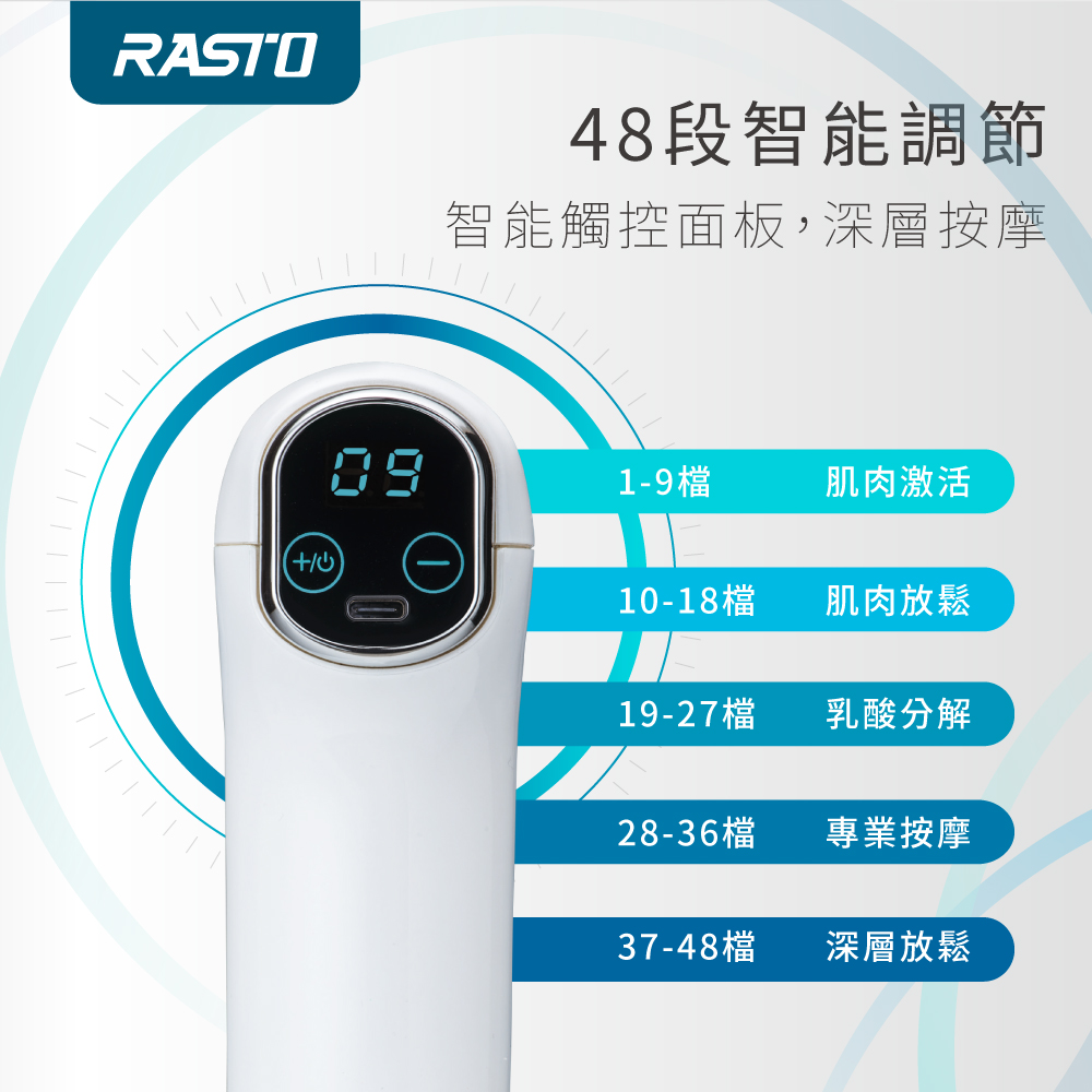 RASTO AM5 液晶顯示 48 段深層筋膜槍,提供精準力道調節與四款專業按摩頭,從肩頸到腿部全方位舒緩。液晶觸控面板操作直覺、Type-C 快充方便攜帶,並具多重保護機制使用更安心。無論是運動後放鬆、工作後解壓或長輩日常保養,AM5 都能快速帶來深層舒緩與恢復感。立即入手,給自己或家人一支能天天用的專業級放鬆利器!