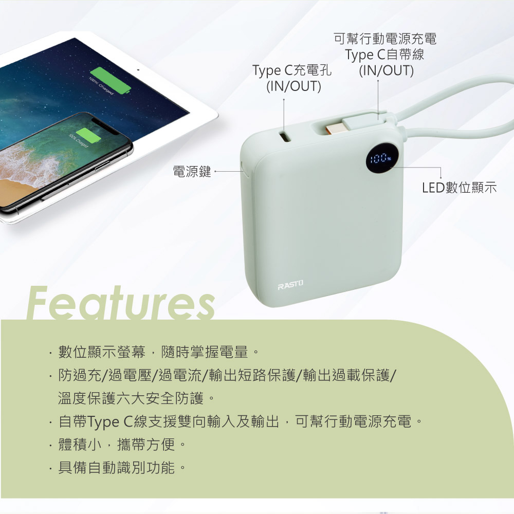 擁有 數位顯示螢幕,電量清楚看得見;自帶 Type-C快充線,支援雙向輸入與輸出,還能同時替兩台裝置充電!
