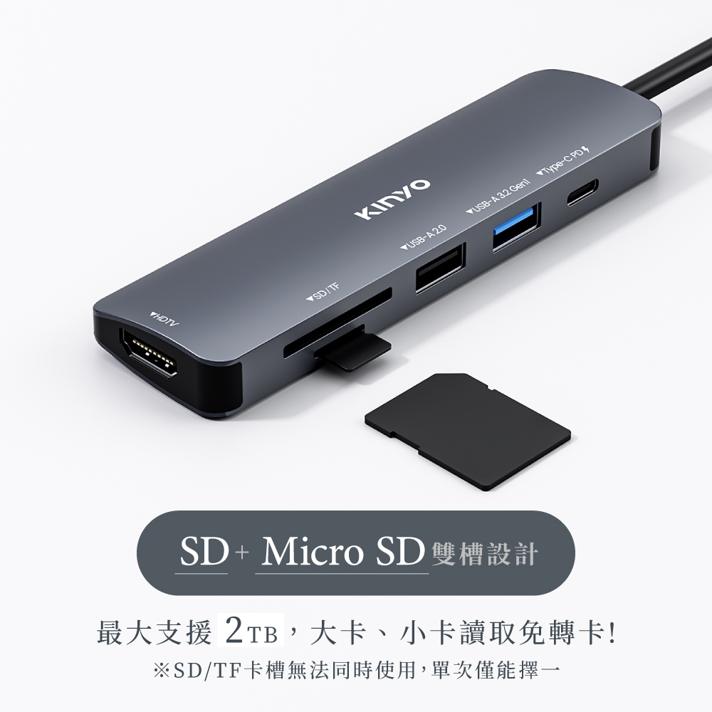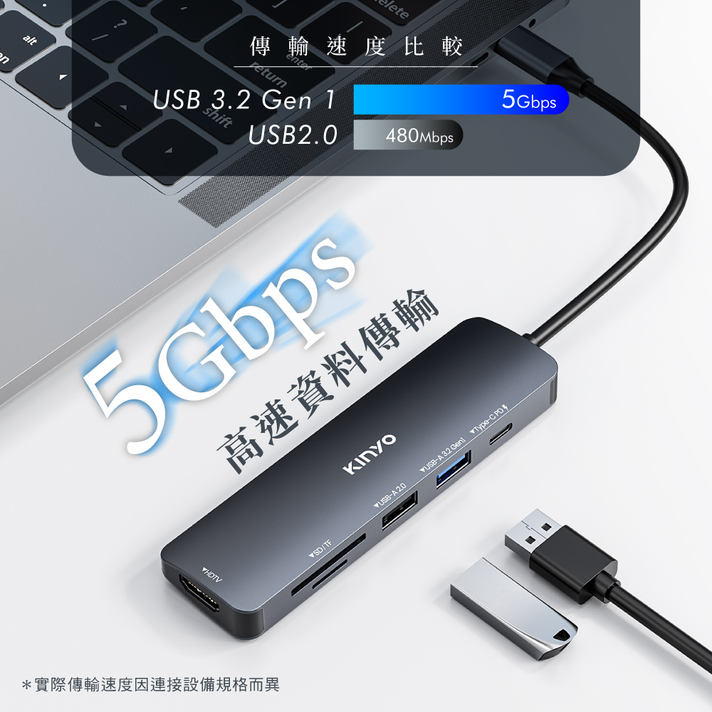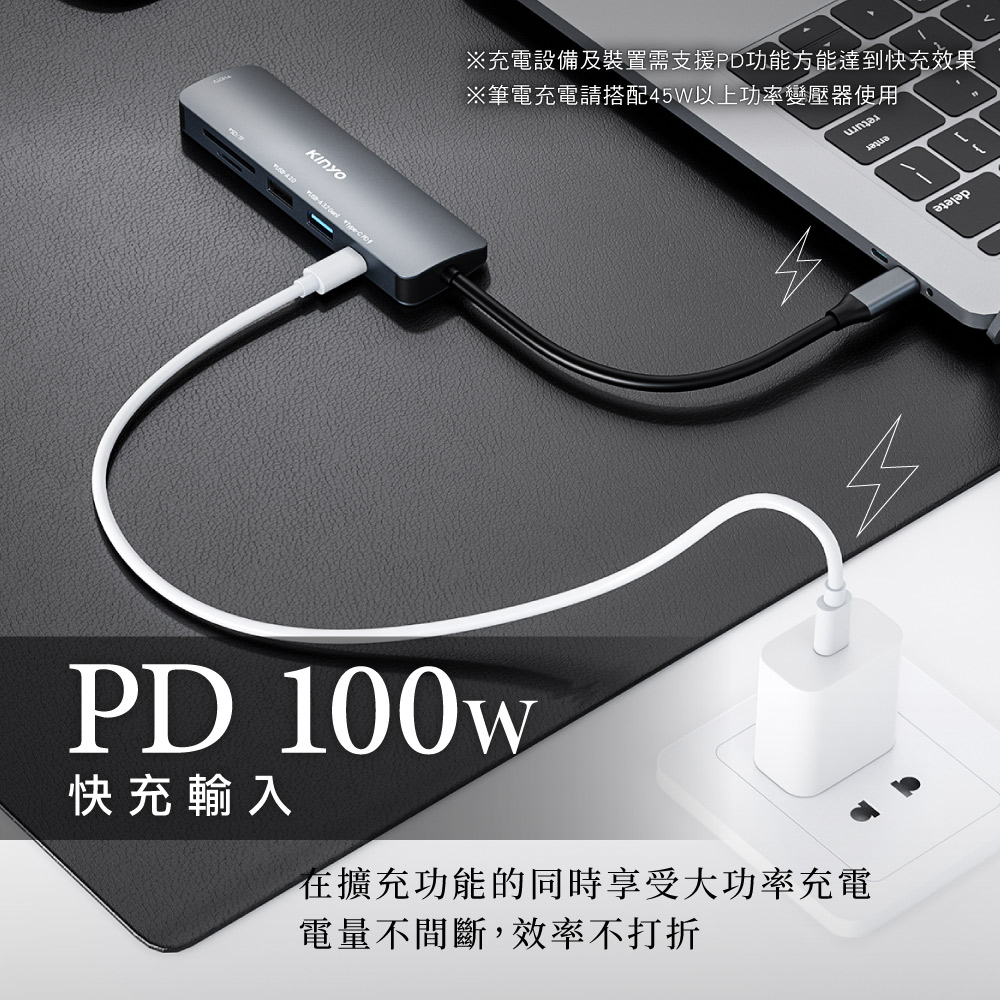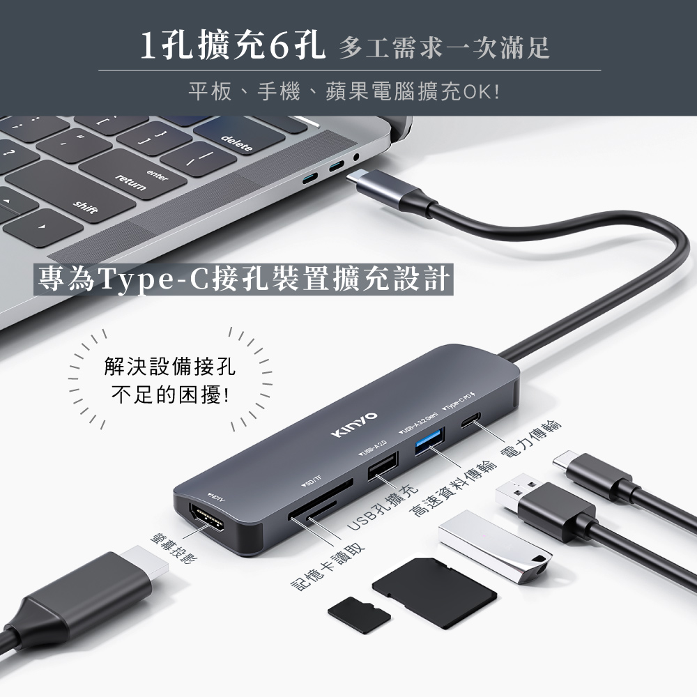 KINYO 六合一多功能擴充座 (KCR-526),專為 Type-C 裝置設計,